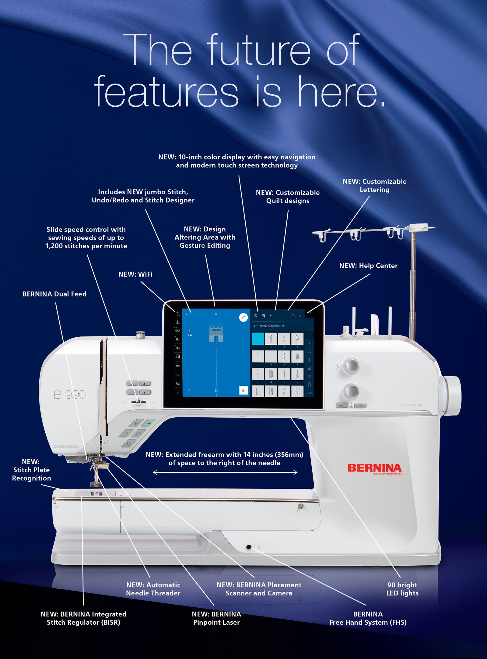The BERNINA 990 embodies Swiss engineering excellence with its spacious design, intuitive technology, and versatility.