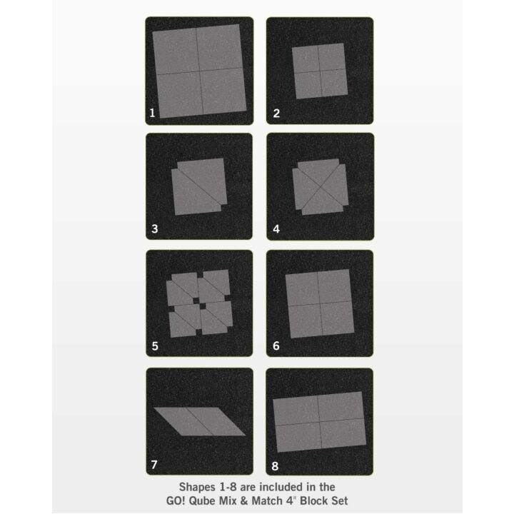 The GO! Qube Mix & Match 4” Block includes eight GO! Dies, a cutting mat, and a free pattern booklet that includes 14 Mix & Match block patterns. Combine these dies to make over 72 different Mix and Match Blocks quickly, accurately, and safely every time!