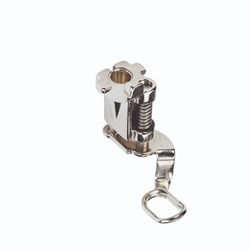 The vertical spring on the presser foot presses the sole to the fabric, preventing the material from pulling up with the needle (flagging). The result is a neat, consistent stitch pattern. What’s more, this oval foot with its slight upward tilt facilitates the stitching movement, even over bulky materials.