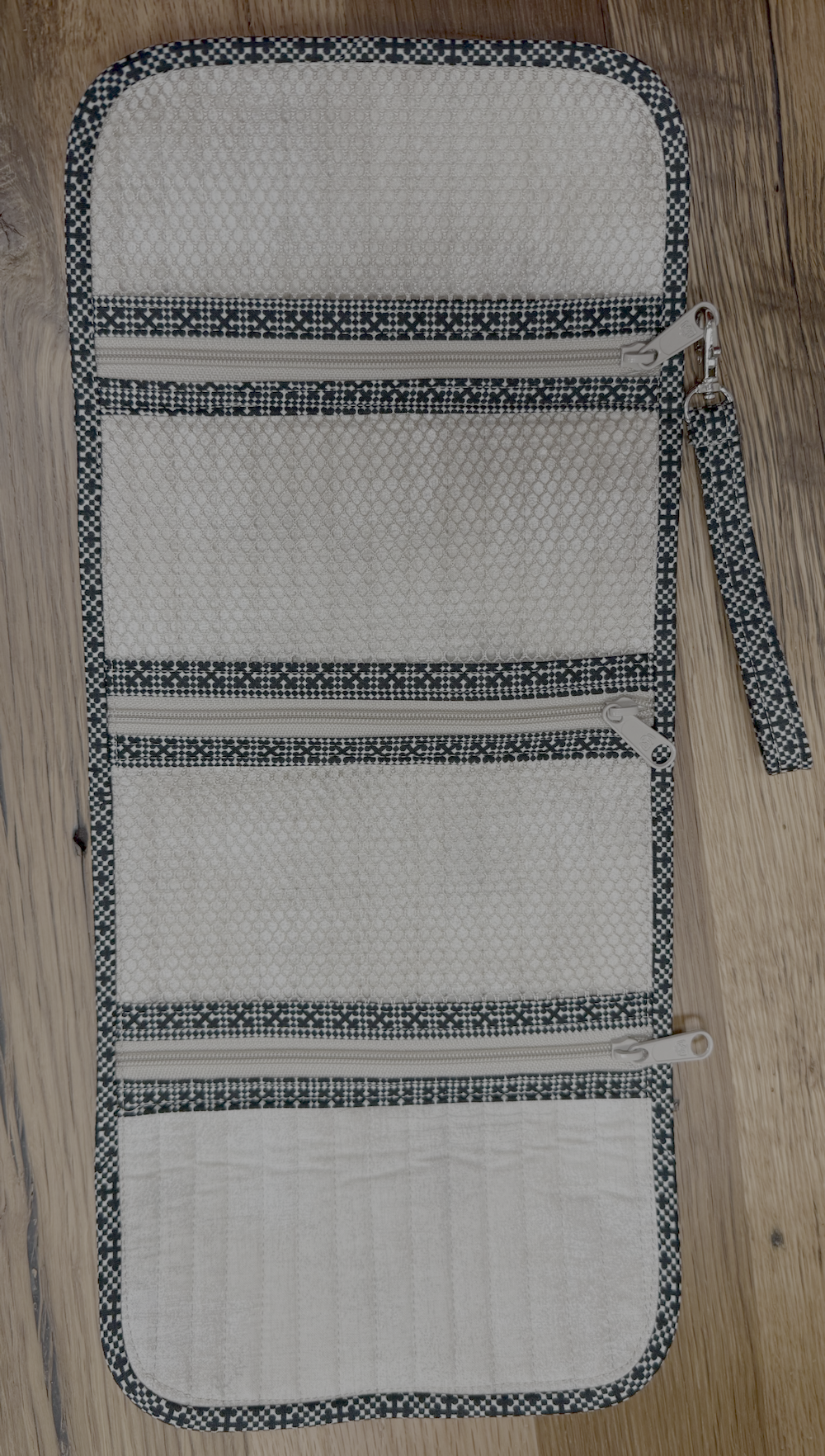 This handy little bag features three zippered inner pockets. The mesh pockets allow easy visibility of contents. This wrap bag can be used for sewing/crafting supplies, cosmetics, tech gear, or a purse organizer - the possibilities are endless! We will also make a bonus wrist strap to use with the bag.