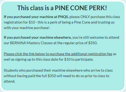 If you purchased your machine at PNQS, please ONLY purchase this class registration for $10 - this is a perk of being a Pine Cone and trusting us with your machine purchase!