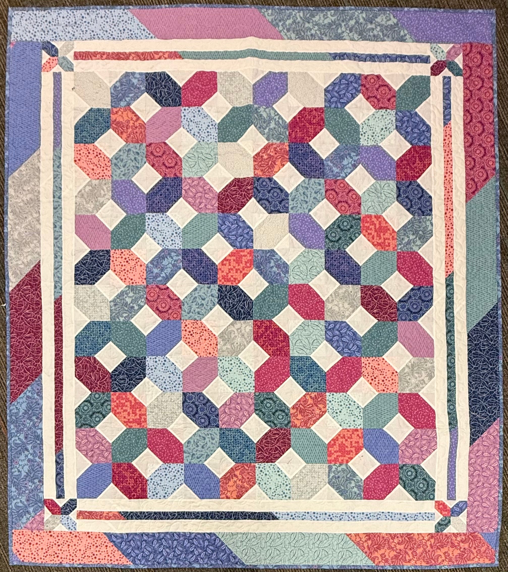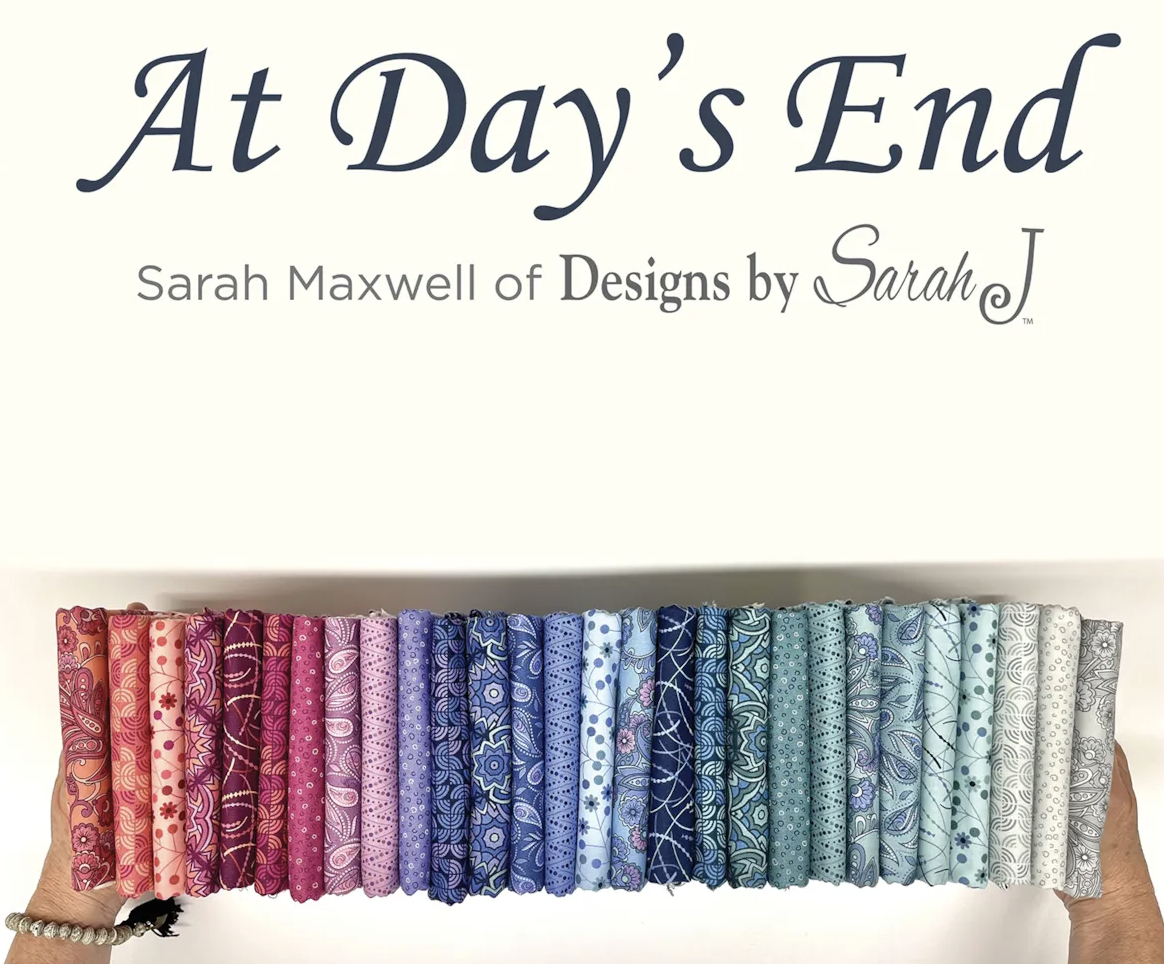 When designer Sarah Maxwell needs to escape from the stresses of everyday life, she escapes to nature. One evening last spring, after a particularly challenging day, Sarah went for a walk and looked up to see a perfect sunset. At Day’s End is her story of quiet calm, respite and finding peace. You will love this beautiful collection with its vibrant pinks, lively purples, soft teals, lovely blues and whisper grays.