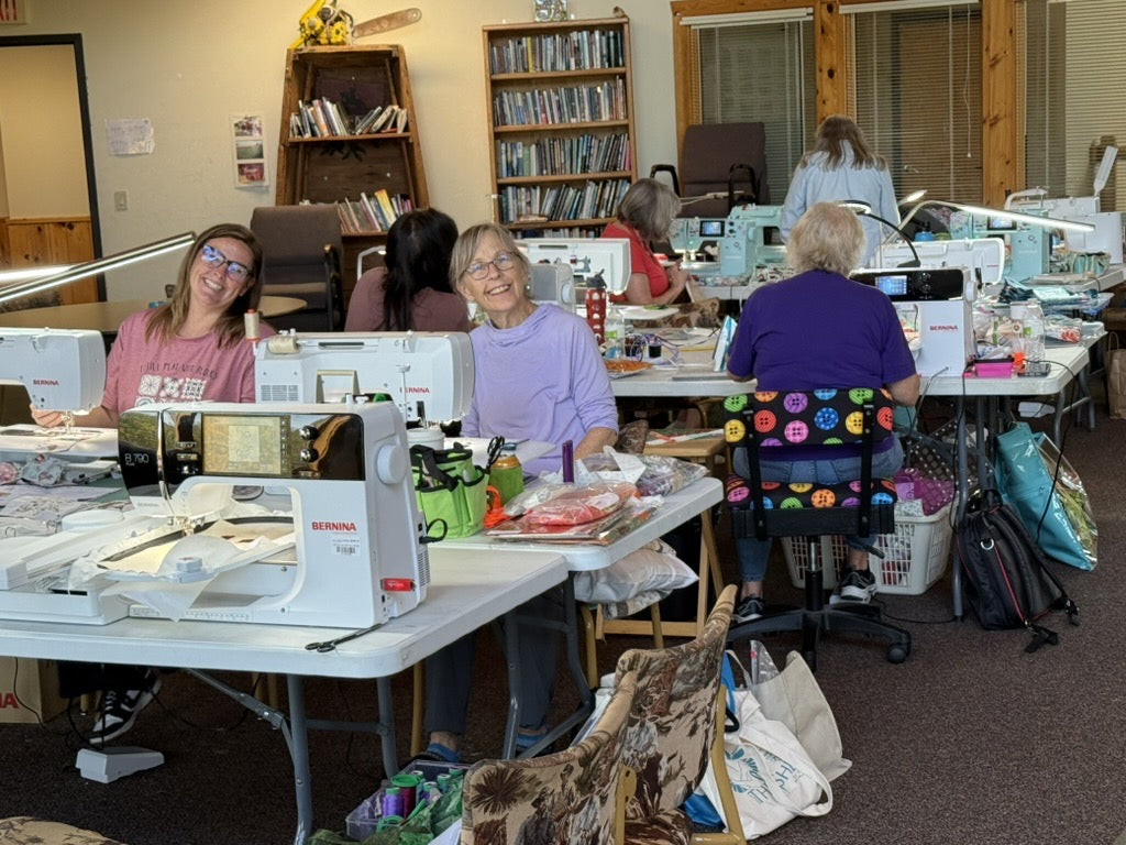 Our sewing area is very large with a mini kitchen, microwave, coffee, and full size refrigerator on one side.