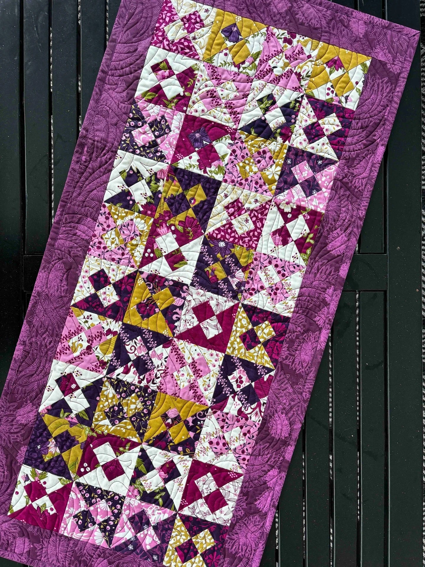 Make this table runner much faster and easier then it looks using the Stripology Rulers! Full color instructions include how to use regular rulers, as well. Size: 15-1/2" x 39-1/2"