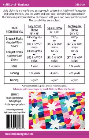 Little Lights is a cheerful and scrappy star quilt pattern that is jelly roll, fat quarter and scrap friendly. Use the warm and cool color combination suggested in the fabric requirements or come up with your own color combinations! The possibilities are endless!