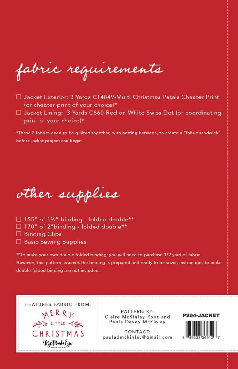 The Quilted Jacket by Paula McKinlay and Claire Root is the perfect one size fits almost all quilted jacket. Repurpose a twin size or larger quilt or create your own quilted fabric. You will need (2) 3 yard cuts for the outside and lining. You will also need batting and 170" of 2" binding and 155" of 1 1/2" binding.