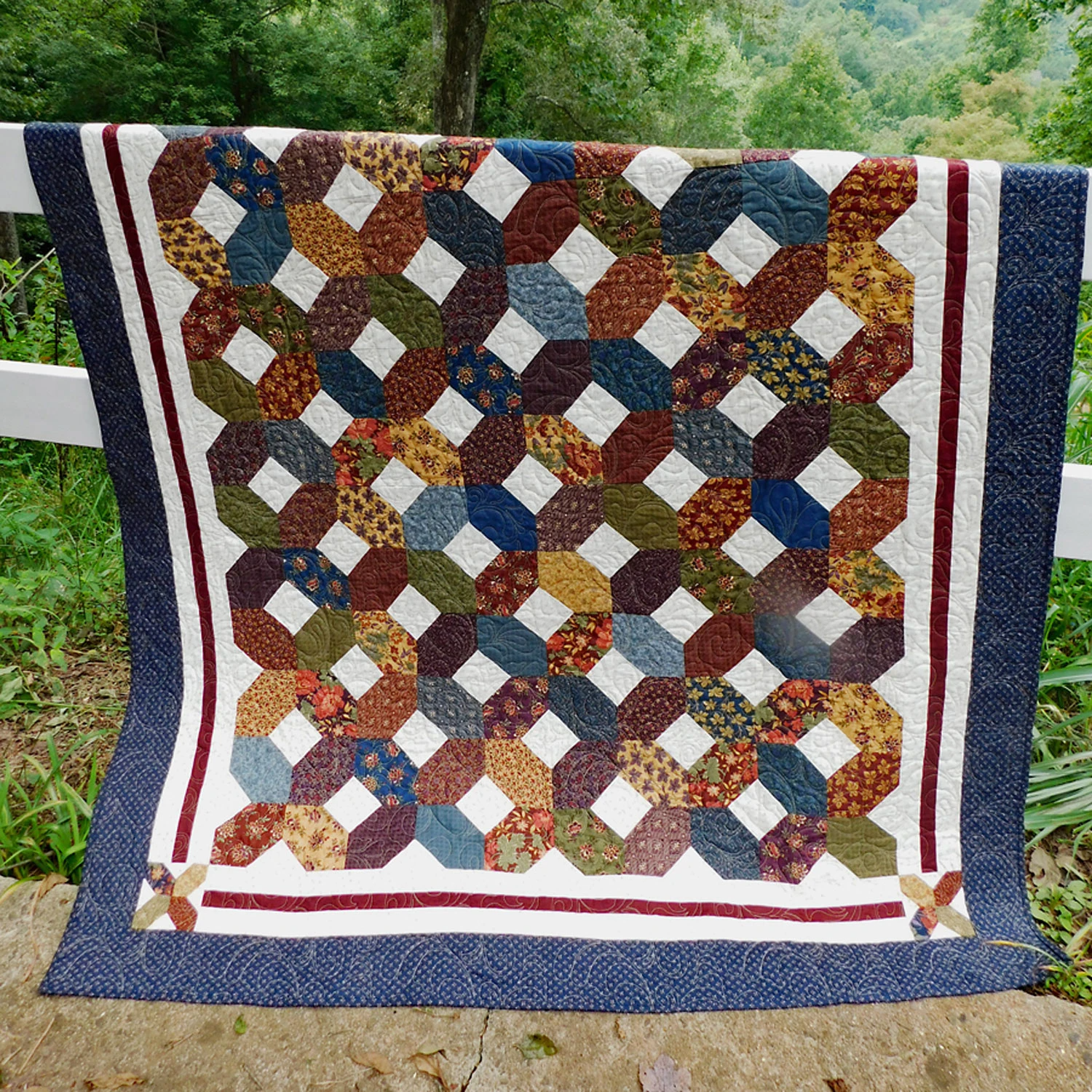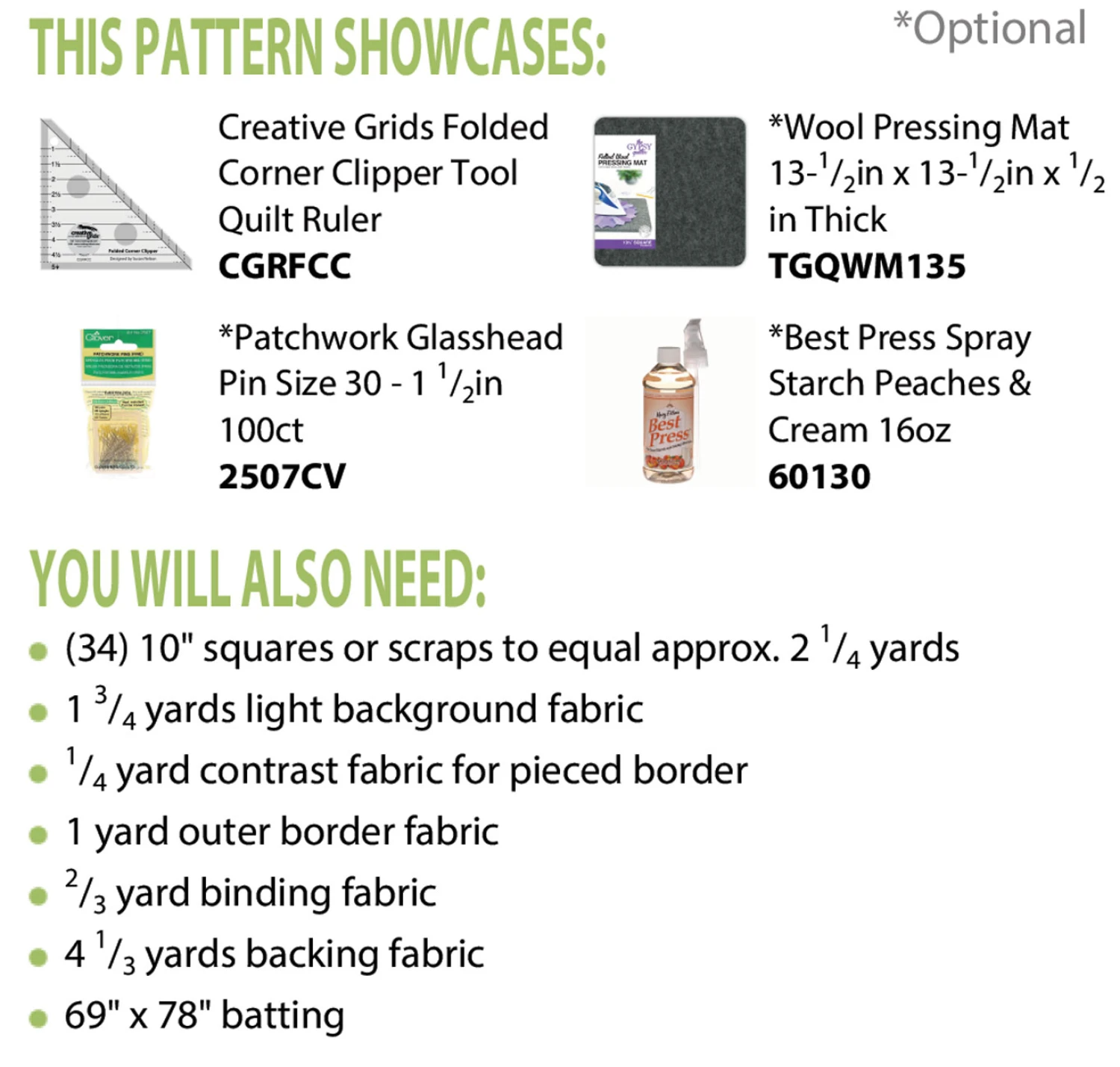 What a great scrap quilt! Just (34) 10-inch squares is all you need to create this generous 61 x 70-inch quilt. And, it is the perfect quilt to learn how to use the Creative Grids Folded Corner Clipper or Corner Clipper XL for more than bindings. All you need to add is the four B’s: background, borders, binding and backing.