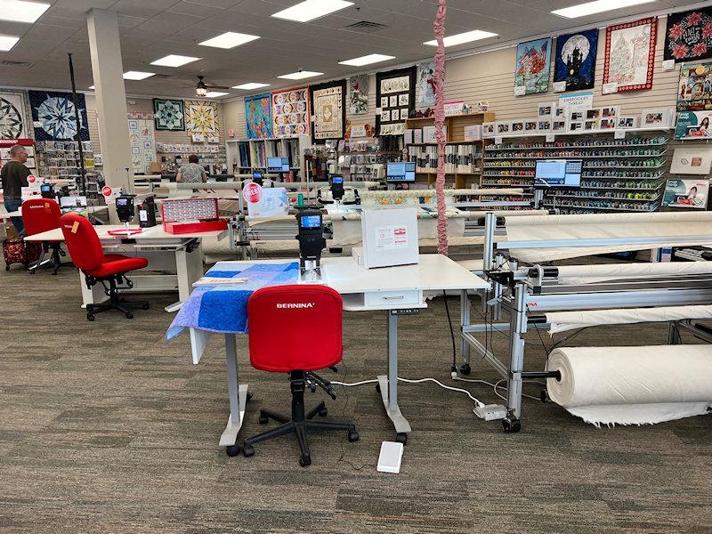 Full line of machines, sergers, and long arms displayed and demonstrated in the shop.