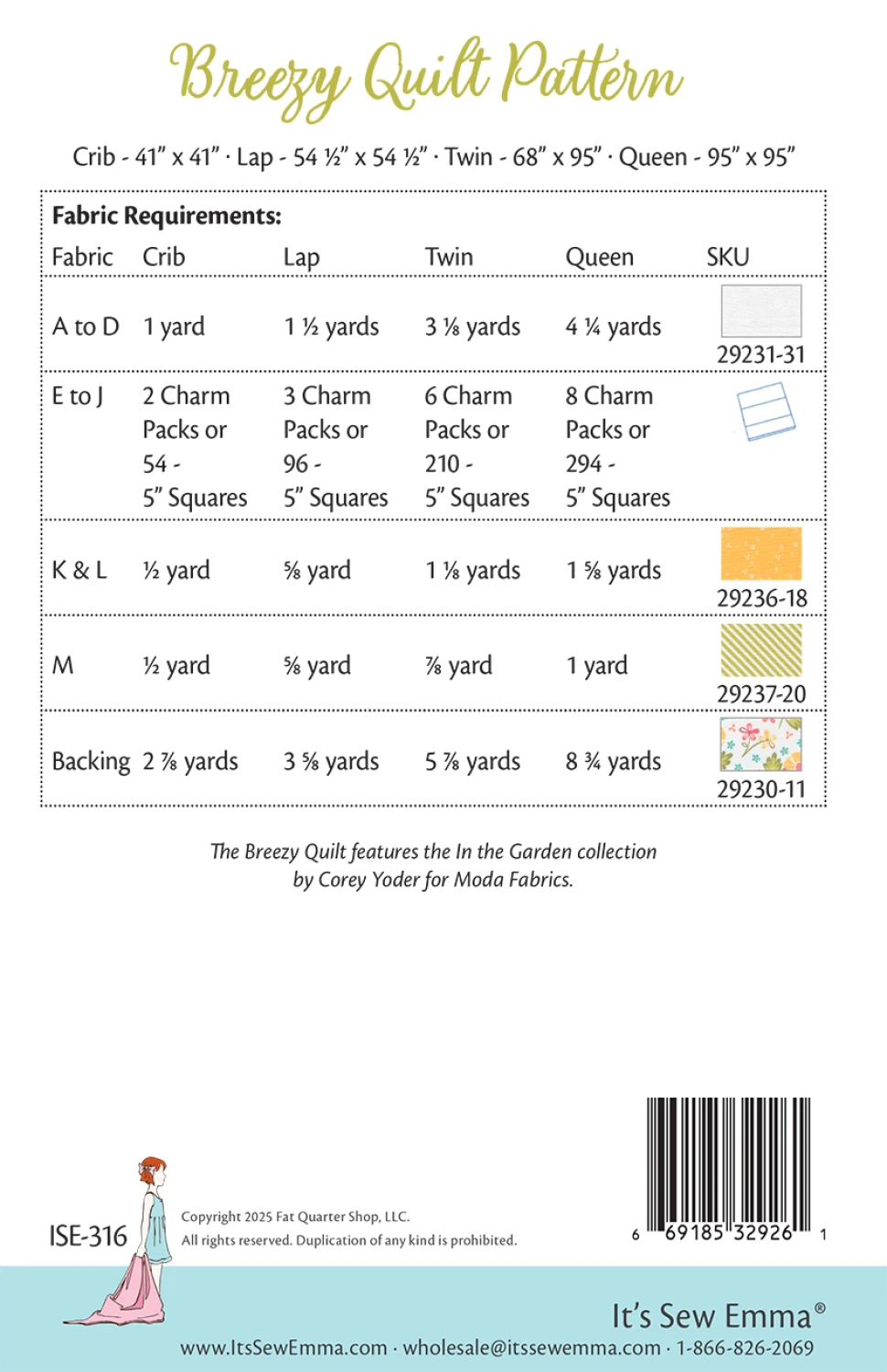 The Breezy Quilt Pattern radiates summer charm with happy golden stars crisscrossing a colorful checkerboard design. Grab your favorite charm packs and enjoy creating the perfect quilt top-it’s as easy as it is breezy! Finished sizes: Crib Quilt 41 in x 41 in / Lap Quilt 54.5 in x 54.5 in / Twin Quilt 68 in x 95 in Queen Quilt 95 in x 95 in