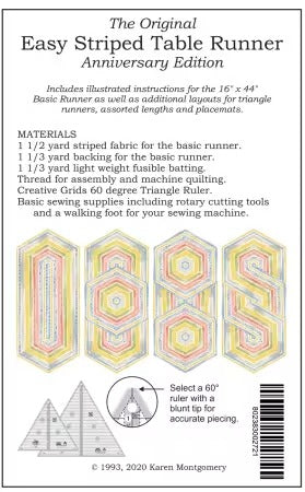 The Quilt Company Easy Striped Table Runner Pattern- Using striped fabric this is the easiest table runner project that you will ever make! The magic is in the cutting and your 60 triangle ruler. Once cut you only have 5 seams to sew and the top is finished. I can hear you say no way, But it's true, way true! Finished size approximately 16in x 45in. Uses the CGRT12560 or the CGRT60 ruler.