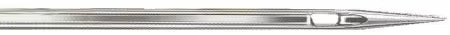 Needle Size: 60/8 with reinforced blade. Feature: Very slim acute point. Fabric Use: Micro fibers, polyester, silk, foils, artificial leather, coated materials. Very thin acute point creates beautiful topstitching and perfectly straight stitches for quilt piecing when precision is paramount.